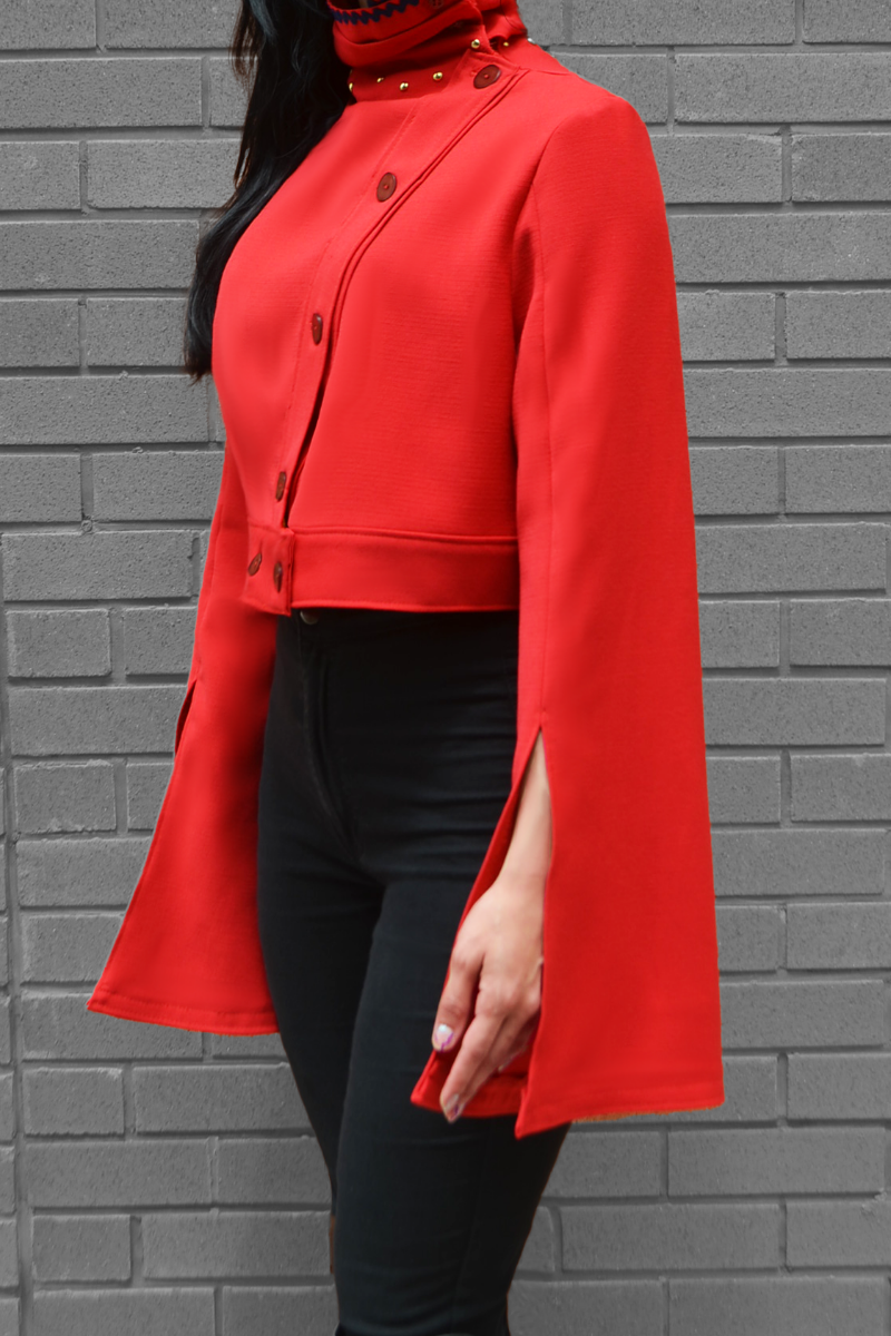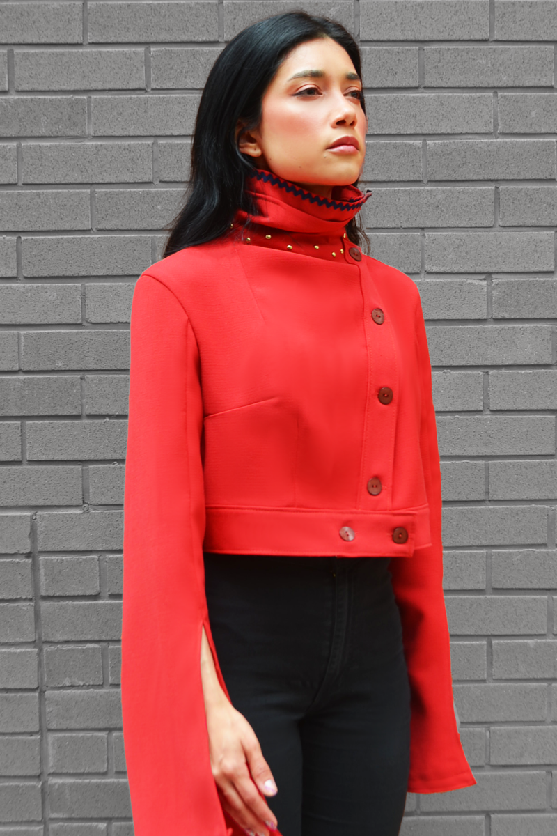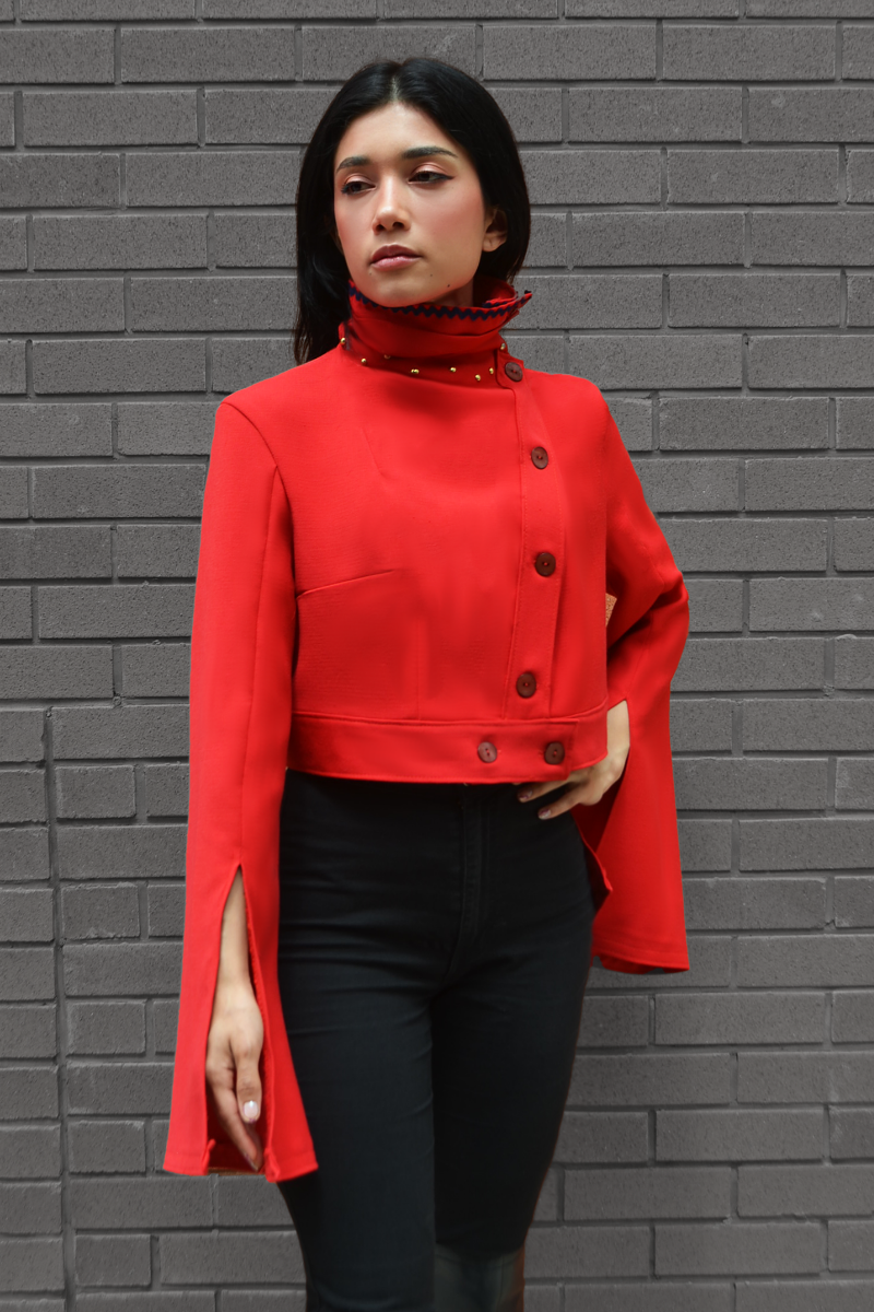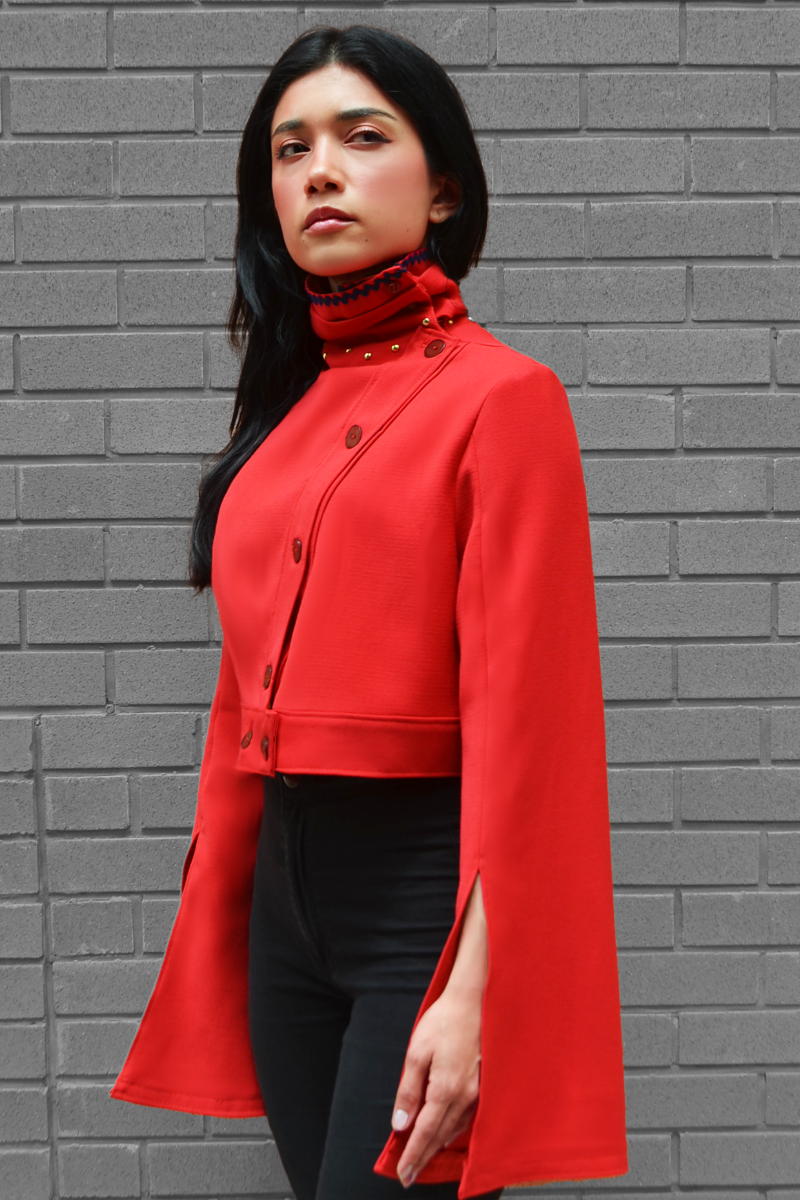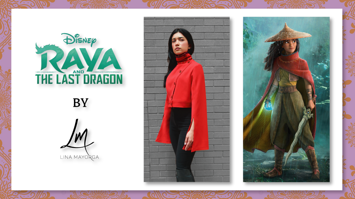 Our piece features a side sleeve, high neck, and gold trims and brings Raya's look to the modern woman. This modern take on Raya's cape was created to promote the release of the movie in theaters and Disney+.