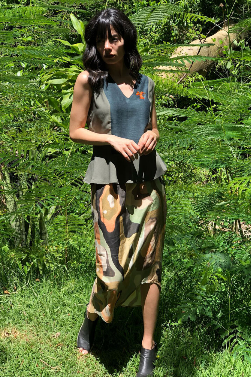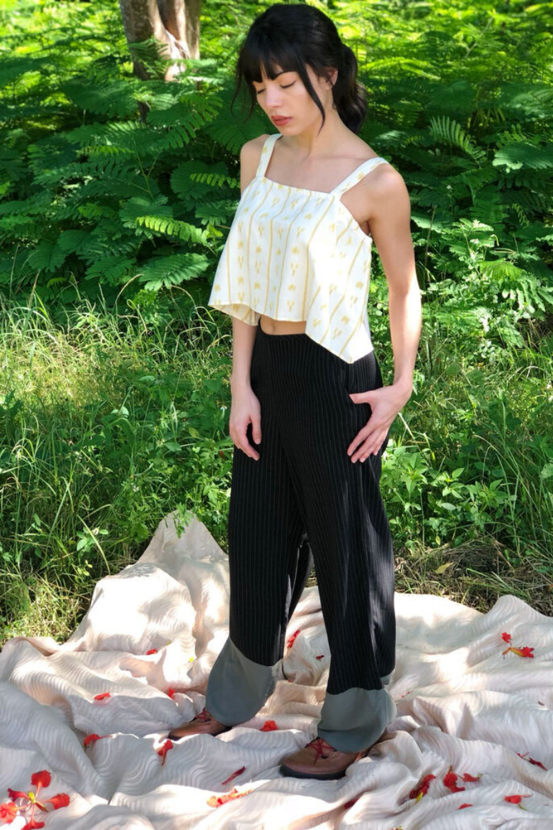 Exclusive Lina Mayorga’s Asymmetrical Top was designed and produced in New York and made of upcycled fabrics and constructed with a zero-waste pattern technique.